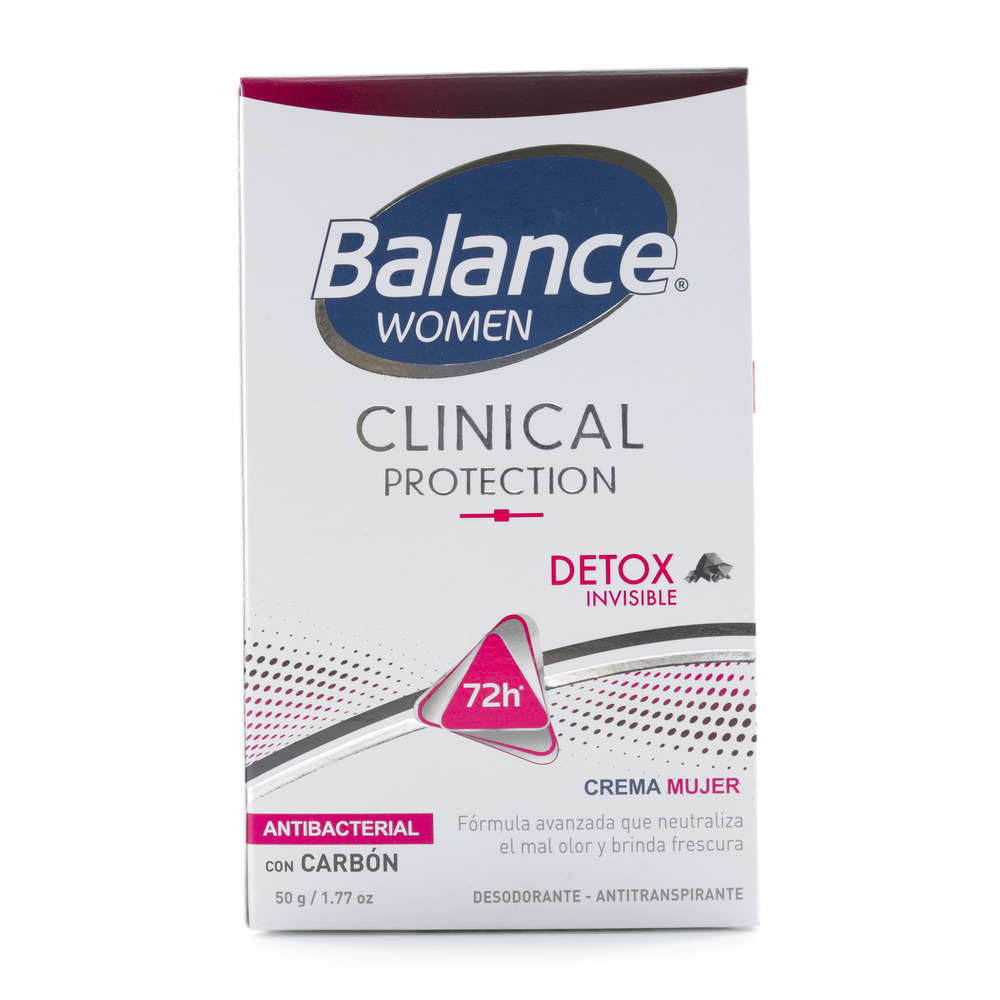 Características del Desodorante Balance Crema Clinical Detox Invisible Mujer 50Gr. Elimina el 99.9% de las bacterias que causan el mal olor gracias a su efectiva acción antibacterial.