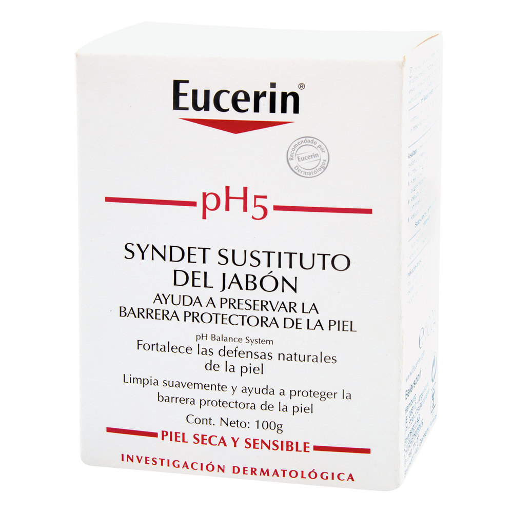 Eucerin pH5 Syndet Barra es un producto de limpieza suave en barra, diseñado para la piel sensible. Su pH es neutro para la piel, mientras que su combinación de Tampón de Citrato pH5 y los tensoactivos extra suaves ayuda a proteger la actividad enzimática, manteniendo la función de barrera de la piel y protegiéndola de la resequedad. Adecuada para el uso diario en la cara y en las manos.